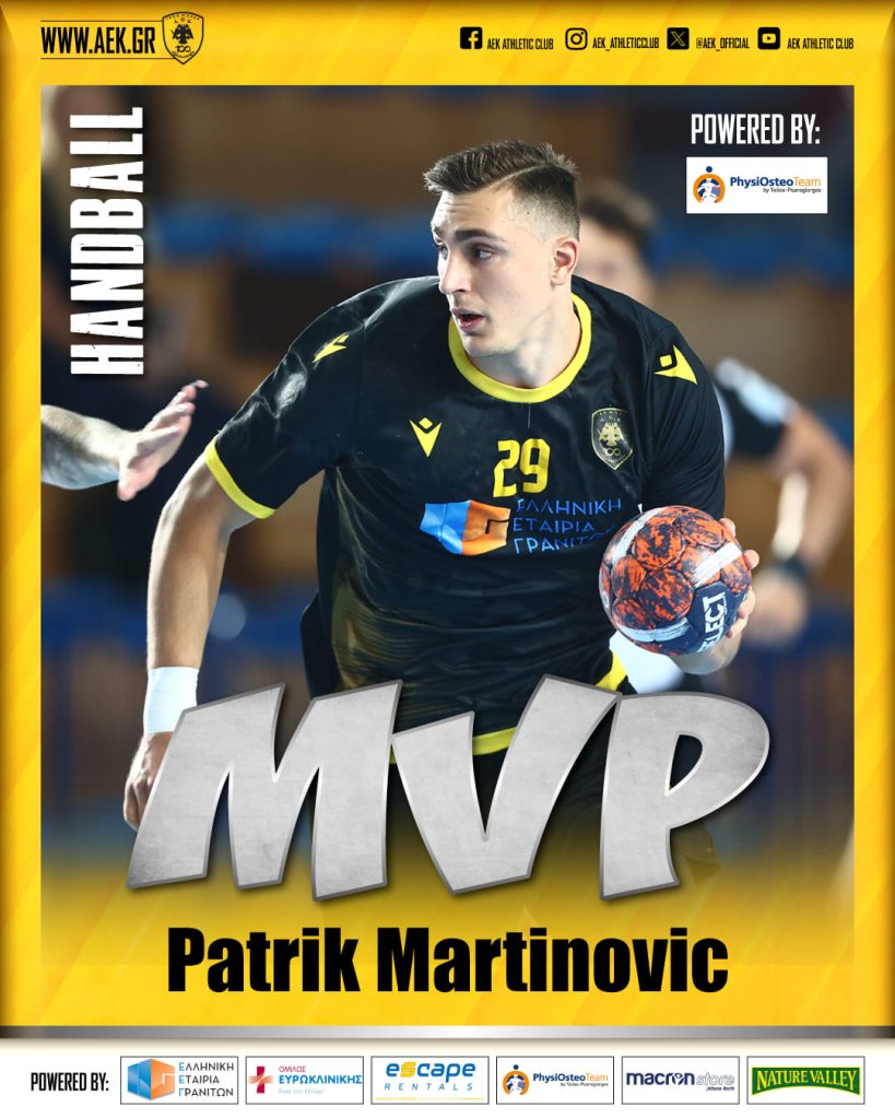 Η ομάδα χάντμπολ της ΑΕΚ πέρασε ένα εύκολο απόγευμα στο Κιλκίς, καθώς πήρε άνετη νίκη επί της τοπικής ομάδας (18-37) για την 6η αγωνιστική του Πρωταθλήματος της Handball Premier. Σε αυτότ ο παιχνίδι η Ένωση είχε κορυφαίο παίκτη τον Πάτρικ Μαρτίνοβιτς, ο οποίος μάλιστα αναδείχθηκε και PhysiOsteo Team MVP, πετυχαίνοντας 7 τέρματα.
