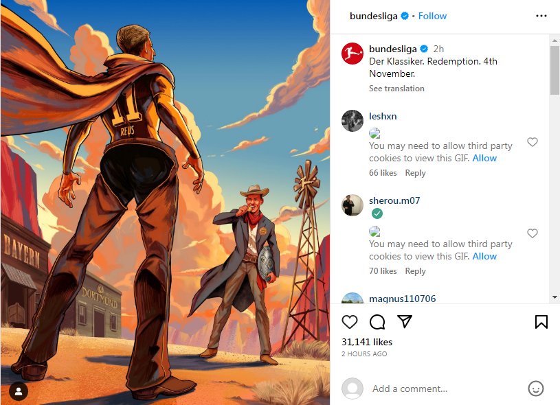 Θέλοντας να προλογίσει το σπουδαίο ματς, η Λίγκα ετοίμασε ένα τρομερό εικαστικό. Σε αυτό, ο αρχηγός της Ντόρτμουντ, Μάρκο Ρόις, και ο μελλοντικός ηγέτης της Μπάγερν Μονάχου, Τζαμάλ Μουσιάλα, παρουσιάζονται σε ένα γουέστερν σκηνικό με κάθε ομάδα να έχει από ένα σαλούν, με τον δεύτερο να έχει στα χέρια του την πιατέλα της Bundesliga και τον πρώτο φορώντας την κάπα του να είναι έτοιμος να του την πάρει.
