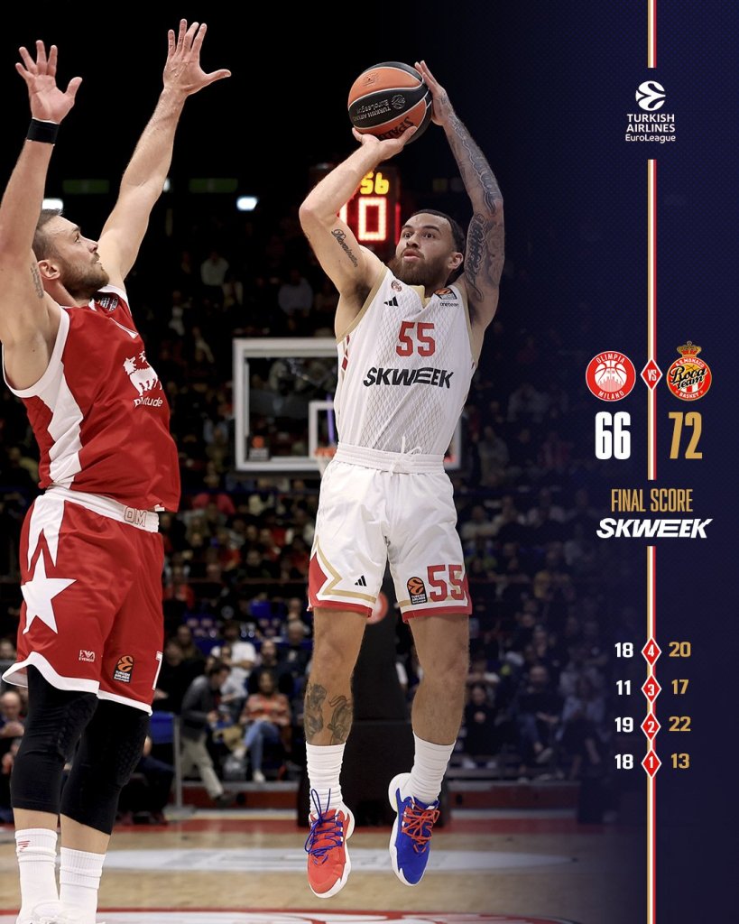 ΑΡΜΑΝΙ ΜΙΛΑΝΟ (Μεσίνα): Λο 2 (4 ριμπάουντ, 4 ασίστ) , Πόιθρες 6, Τονούτ 9 (3/5 τρίποντα, 3 ριμπάουντ, 3 ασίστ) , Μέλι 6, Ρίτσι, Φλακαντόρι, Χολ 15 (3), Σιλντς 17 (4/6 δίποντα, 3/8 τρίποντα, 4 ριμπάουντ, 4 ασίστ, 6 λάθη), Μίροτιτς 9 (1/3 δίποντα, 1/4 τρίποντα, 4/5 βολές, 9 ριμπάουντ, 2 ασίστ) , Χάινς 2 , Φόγκτμαν (3 ριμπάουντ, 3 ασίστ)