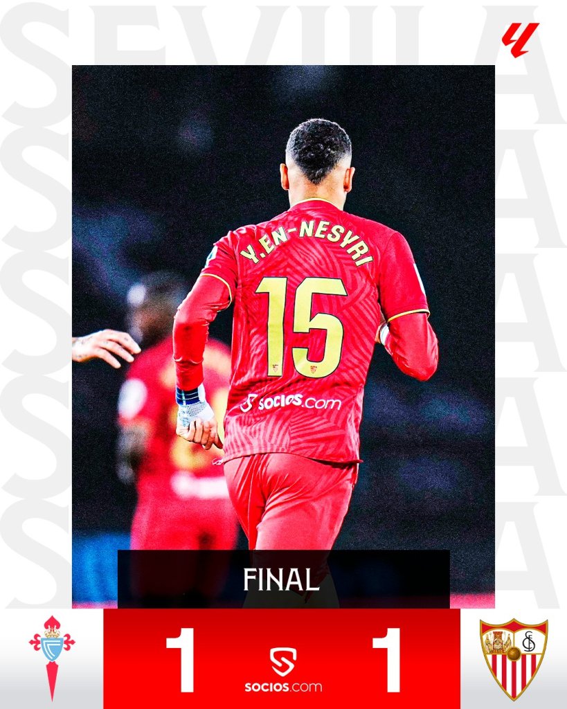 Στο 54’ ο πορτιέρε των γηπεδούχων είπε όχι στον Οκάμπος, ενώ στο 64’ το σουτ του Ράκιτιτς πέρασε δίπλα από το δοκάρι. Ένα λεπτό αργότερα η Θέλτα έμεινε με δέκα παίκτες, λόγω αποβολής του Τάπια και τελικά στο 85ο λεπτό η Σεβίλλη έκανε το 1-1 με πλασέ του Εν Νεσίρι από κοντινή απόσταση.