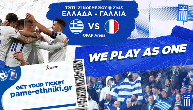 Στη διάθεση των φιλάθλων τέθηκαν τα εισιτήρια του αγώνα Ελλάδα - Γαλλία για την 10η αγωνιστική των European Qualifiers, ο οποίος θα διεξαχθεί την Τρίτη 21 Νοεμβρίου και ώρα 21:45 στην OPAP Arena.
