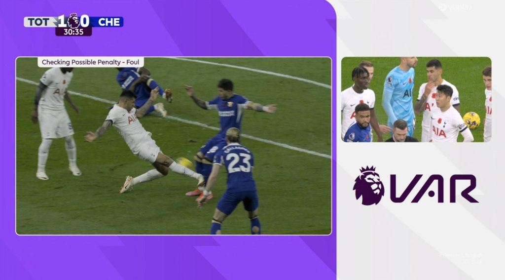 Στο 28’ ο Καϊσέδο σκόραρε με συρτό σουτ. Κι αυτό το γκολ ακυρώθηκε με αυστηρό οφσάιντ ενώ από το VAR φάνηκε πως στο ξεκίνημα της φάσης ο Ρομέρο είχε κάνει πέναλτι στον Φερνάντες. Το μαρκάρισμα ήταν μάλιστα τόσο σκληρό που ο Όλιβερ απέβαλε τον αμυντικό της Τότεναμ. Ο Πάλμερ εκτέλεσε το πέναλτι και ισοφάρισε σε 1-1.