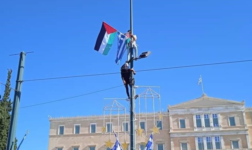 Στο αστυνομικό τμήμα οδηγήθηκε ένας 22χρονος Παλαιστίνιος, ο οποίος την περασμένη Κυριακή ύψωσε την σημαία της χώρας του - δίπλα στην ελληνική - σε στύλο φωτισμού στην πλατεία Συντάγματος κατά τη διάρκεια συγκέντρωσης του ΠΑΜΕ. Εναντίον του σχηματίστηκε δικογραφία από την ΕΛΑΣ.