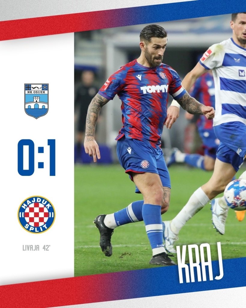 Τεράστιο διπλό διά… ποδός Λιβάγια για τη Χάιντουκ. Η ομάδα του Μίσλαβ Κάρογκλαν πέρασε με 1-0 από την έδρα της Όσιγιεκ και βρέθηκε μόνη πρώτη αν κι έχει ένα ματς παραπάνω από τη Ριέκα. Το «χρυσό» γκολ πέτυχε ο Μάρκο Λιβάγια στο 42ο λεπτό με όμορφο πλασέ κι αυτό ήταν το 6ο του τέρμα στη σεζόν.