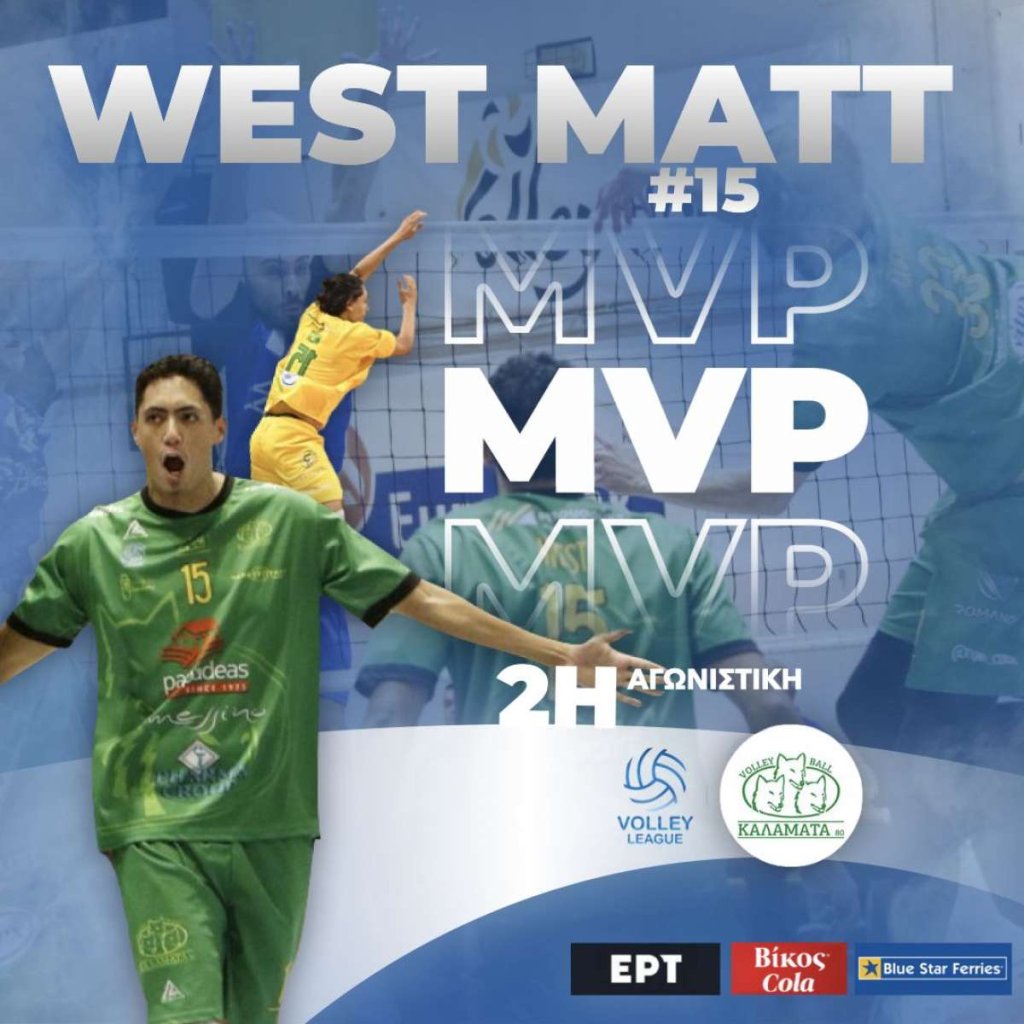 Ο Αμερικανός πασαδόρος του ΑΟ Καλαμάτα 80, Ματ Γουέστ αναδείχθηκε ο MVP της 2ης αγωνιστικής της Volley League Ανδρών. Η επίσημη ενημέρωση του ΕΣΑΠ έχει ως εξής: «Ο 30χρονος Αμερικανός πασαδόρος του Α.Ο.Καλαμάτα 80 Ματ Γουέστ αναδείχτηκε πολυτιμότερος αθλητής MVP Βίκος Cola της 2ης αγωνιστικής στο πρωτάθλημα Volley League 2023-24.
