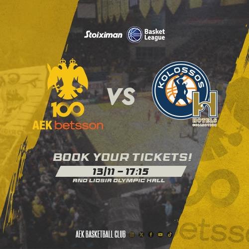 Η ΑΕΚ υποδέχεται τον Κολοσσό Ρόδου για την 6η αγωνιστική της Basket League, την προσεχή Δευτέρα (13/11, 17:15) στο Olympic Hall των Άνω Λιοσίων. Ο κόσμος της Βασίλισσας μπορεί πλέον να κλείσει θέση στο γήπεδο, αφού τέθηκαν σε κυκλοφορία τα εισιτήρια. Η επίσημη ανακοίνωση της ΚΑΕ ΑΕΚ έχει ως εξής: «Η ΑΕΚ ΒETSSON BC ανακοινώνει, ότι ξεκίνησε η διάθεση των εισιτηρίων για την αναμέτρηση της «Βασίλισσας» με αντίπαλο τον Κολοσσό Ρόδου H Hotels Collection.