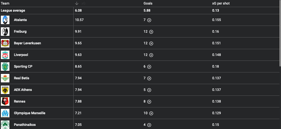 Η ΑΕΚ σύμφωνα με το Wyscout βρίσκεται στη 7η θέση του πίνακα των xGoals στο Europa League - στο σύνολο 32 ομάδων - με συνολικό δείκτη 7.94. Πάνω από την «Ένωση» όπως μπορείτε να δείτε και στον σχετικό πίνακα βρίσκονται μόνο μεγάλες ομάδες από καλά πρωταθλήματα όπως η Αταλάντα, η Φράιμπουργκ, η Λεβερκούζεν, η Λίβερπουλ, η Σπόρτινγκ Λισσαβόνας και η Μπέτις. Από τις παραπάνω ομάδες -εκτός φυσικά από την ΑΕΚ- έχουν σκοράρει λιγότερο από τον δείκτη xGoals τους μόνο η Αταλάντα, η Σπόρτινγκ και -πολύ οριακά- η Μπέτις.