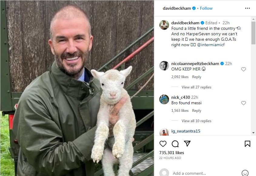 "Βρήκα έναν μικρό φίλο στην εξοχή. Και όχι Χάρπερ, συγγνώμη που δεν μπορούμε να το κρατήσουμε, έχουμε αρκετούς GOATS αυτή τη στιγμή στην Ίντερ Μαϊάμι", έγραψε ο Ντέιβιντ Μπέκαμ.