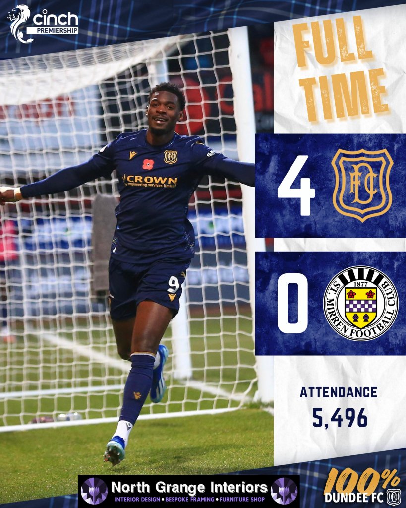 Στις έξι προηγούμενες επισκέψεις της, στο "Dens Park", η Σεντ Μίρεν είχε φύγει αήττητη σε τέσσερις περιπτώσεις, αλλά, το απόγευμα του Σαββάτου, γνώρισε συντριβή, με τη Νταντί να επικρατεί με σκορ 4-0. Στο 16ο λεπτό, ο Αμαντού Μπακαγιόκι άνοιξε το σκορ και, στο δεύτερο λεπτό των καθυστερήσεων του ημιχρόνου, οι γηπεδούχοι διπλασίασαν τα τέρματά τους, χάρη στην εύστοχη εκτέλεση πέναλτι του Ζακ Ρούντεν. Το δεύτερο ημίχρονο ξεκίνησε όπως το πρώτο, με γκολ του Μπακαγιόκο, στο 57', για το 3-0. Το τέταρτο γκολ, για λογαριασμό της Νταντί, σημείωσε ο Ζαχ Ρόμπινσον στο 85ο λεπτό. Πλέον, η Νταντί είναι δυο βαθμούς μακριά από την αντίπαλό της και τη τρίτη θέση.
