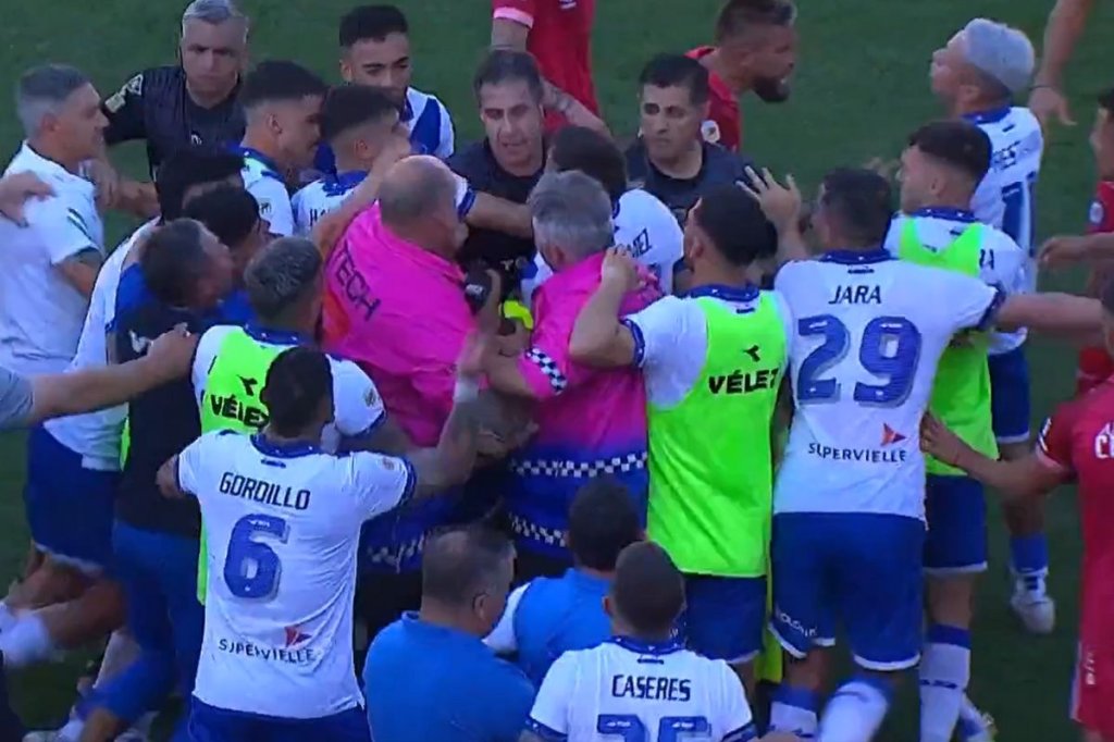 Los jugadores de Vélez se echaron encima del árbitro al término del partido contra Argentinos Juniors.
