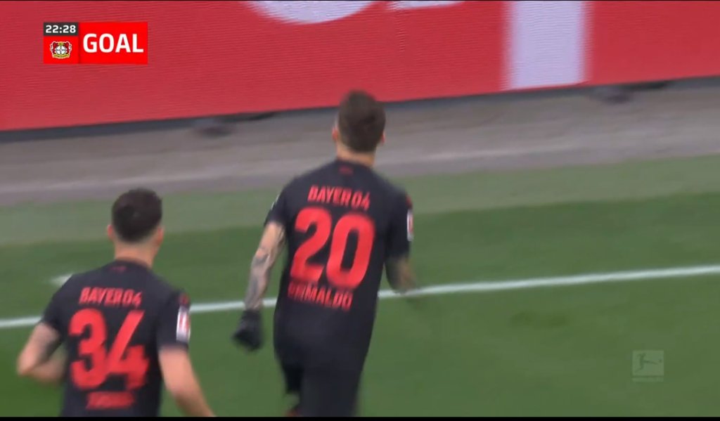Στο 11ο λεπτό, η Λεβερκούζεν απείλησε, για πρώτη φορά, με σουτ του ξεμαρκάριστου Μπόνιφεϊς, ενώ, στο 15', μετά από εκτέλεση κόρνερ, ο Τα έπιασε τη κεφαλιά, αλλά δεν βρήκε στόχο. Τελικά στο 23ο λεπτό, οι παίκτες της Λεβερκούζεν πίεσαν ψηλά, έκλεψαν την μπάλα, ο Βιρτς έστρωσε στον Γκριμάλδο και ο Ισπανός, με φανταστικό πλασέ νίκησε τον Ρόνοου για το 1-0, για το όγδοό του γκολ στα 13 τελευταία παιχνίδια. Με τη συμπλήρωση των 45 λεπτών, ο Βιρτς έκλεψε την μπάλα, πήγε κατά μέτωπο, σούταρε, αλλά ο Ρόνοου απέκρουσε.