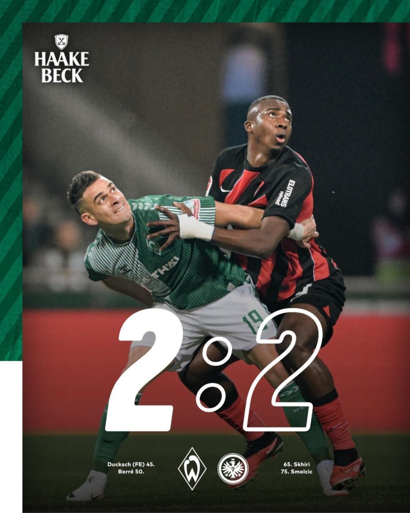 Έφυγε με τον βαθμό από την Βρέμη η Άιντραχτ. Ο σύλλογος της Φρανκφούρτης έμεινε στο 2-2 με την Βρέντερ στο "Weserstadion" κι ενώ μέχρι το 65’ ήταν πίσω στο σκορ με 2-0.