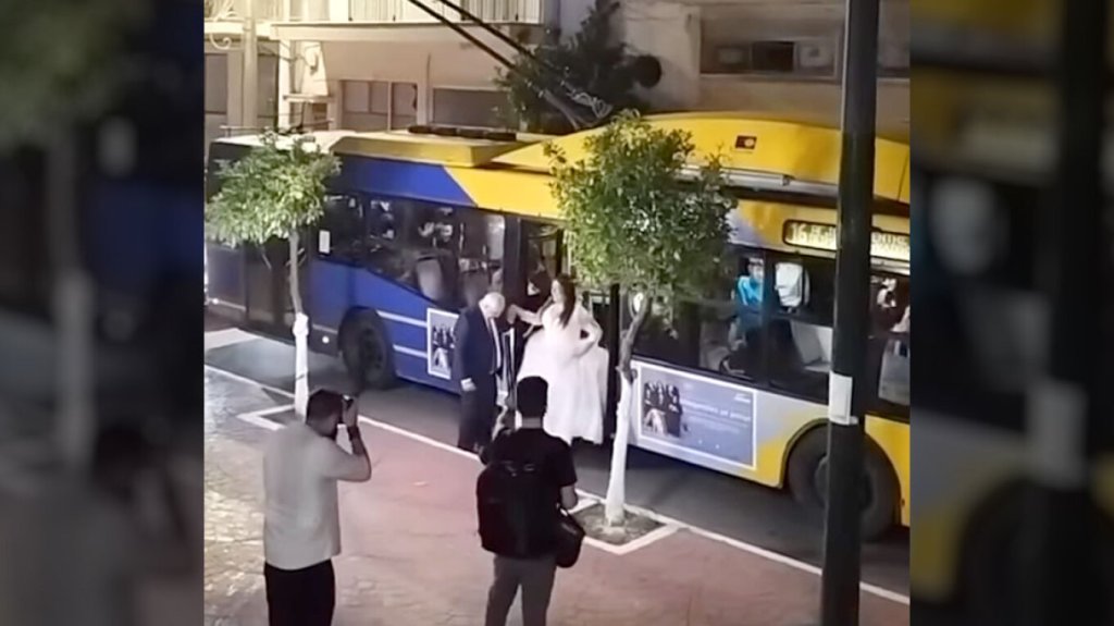 Σύμφωνα με το piraeuspress.gr οι μοναδικές εικόνες καταγράφηκαν έξω από τον ιερό ναό του Αγίου Ελευθερίου στα Καμίνια του Πειραιά. Όπως φαίνεται στο βίντεο η νύφη την οποία συνόδευε ο πατέρας της έφτασε στην εκκλησία με το τρόλεϊ που περνάει από το σημείο.