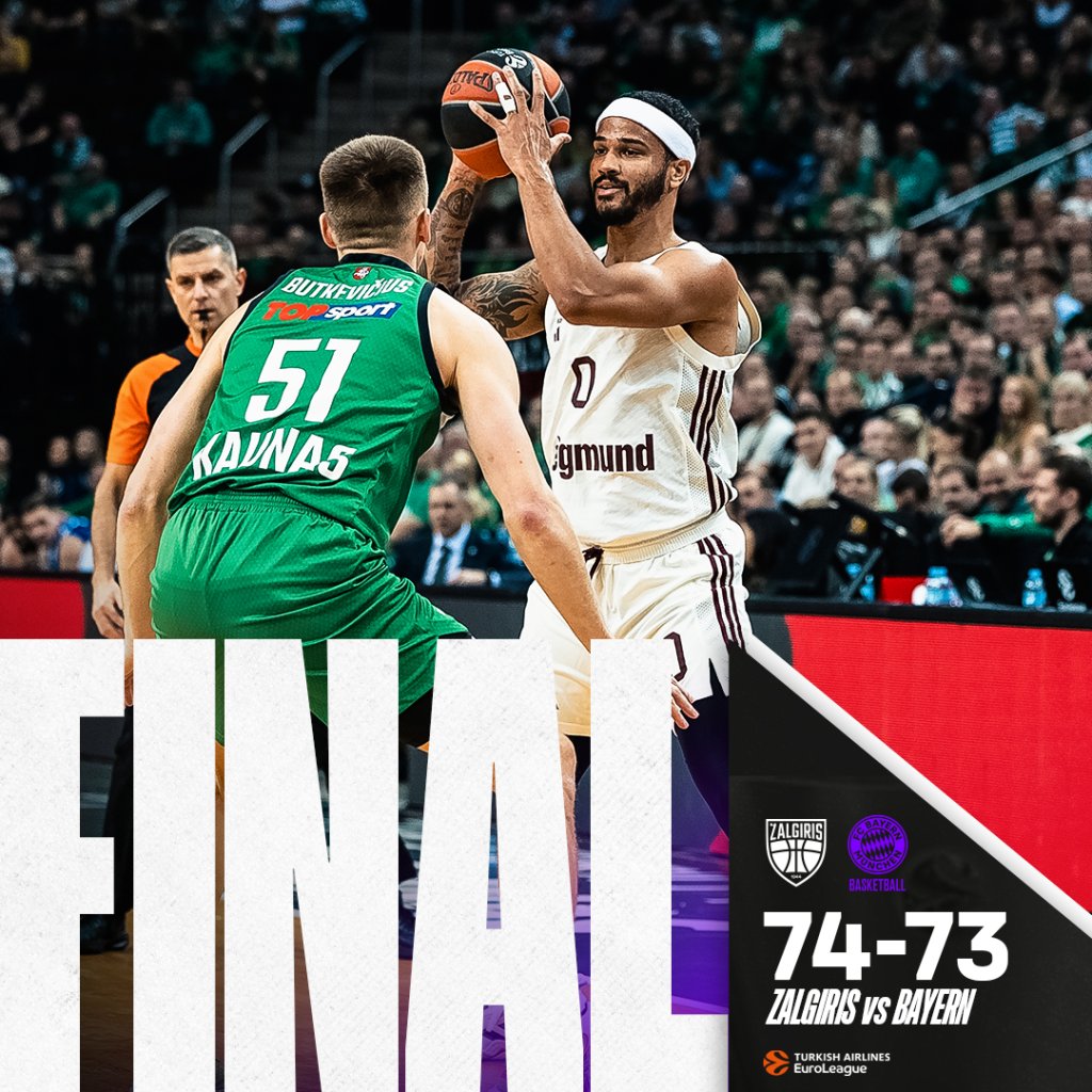 Ο Κίναν Έβανς έδωσε μία μεγάλη νίκη στη Ζαλγκίρις απέναντι στην Μπάγερν Μονάχου με σκορ 74-73, σε ένα ματς που ήταν από την αρχή μέχρι το φινάλε, ντέρμπι