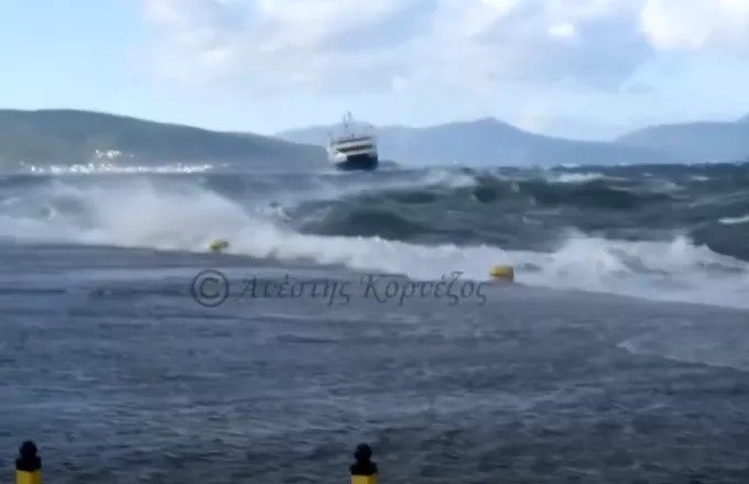 Μάχη με τα κύματα δίνει το πλοίο Αχαιός προκειμένου να δέσει στο λιμάνι της Αίγινας, το οποίο βάλλεται από θυελλώδεις ανέμους.