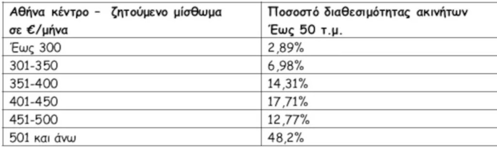 Το κόστος μίσθωσης μιας κατοικίας έως 50τμ, άνω του 1ου ορόφου, κυμαίνεται άνω των 400€ στις περιοχές του κέντρου για το 80% των διαθεσίμων προς μίσθωση κατοικιών, εκ των οποίων το 48,2% έχει ζητούμενο μίσθωμα άνω των 500€/μήνα. «Κατανοούμε ότι το κόστος στέγασης αγγίζει το 60%-70% του μέσου μηνιαίου εισοδήματος, όταν σύμφωνα με τη Eurostat ανεκτό όριο θεωρείται όταν οι στεγαστικές δαπάνες δεν ξεπερνούν το 30% του εισοδήματος. Το ότι οι νέοι εγκαταλείπουν όλο και πιο αργά το πατρικό τους, είναι περισσότερο ανάγκη, παρά επιλογή», εξηγεί ο κ. Μπάκας.