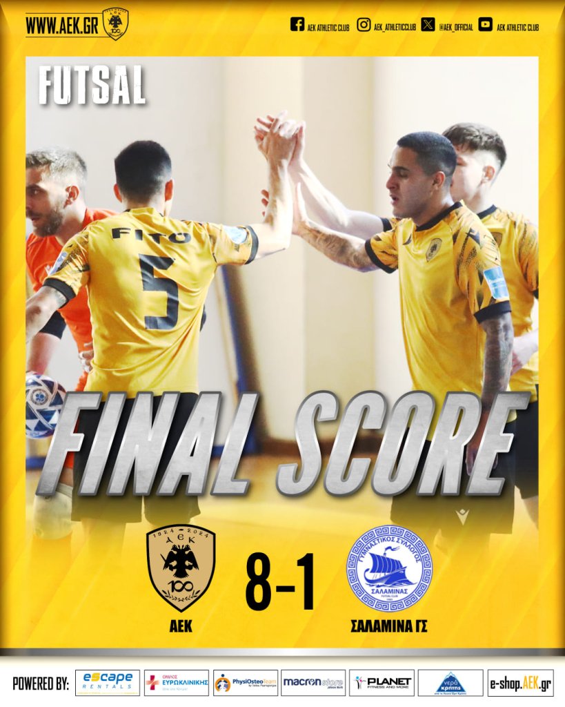 Μεγάλη εμφάνιση και νίκη με το ευρύ 8-1 για την ανδρική ομάδα Futsal της ΑΕΚ κόντρα στη Σαλαμίνα, για την 11η αγωνιστική της Futsal Super League. Η «Ένωση» πραγματοποίησε μία εξαιρετική εμφάνιση και έφτασε στην 9η νίκη της σε 10 αγώνες, ανεβαίνοντας στην κορυφή του βαθμολογικού πίνακα, εκμεταλλευόμενη και την ισοπαλία του Δούκα με την Αθήνα ’90. Εκπληκτική εμφάνιση του Σάλας, που σημείωσε 4 γκολ.