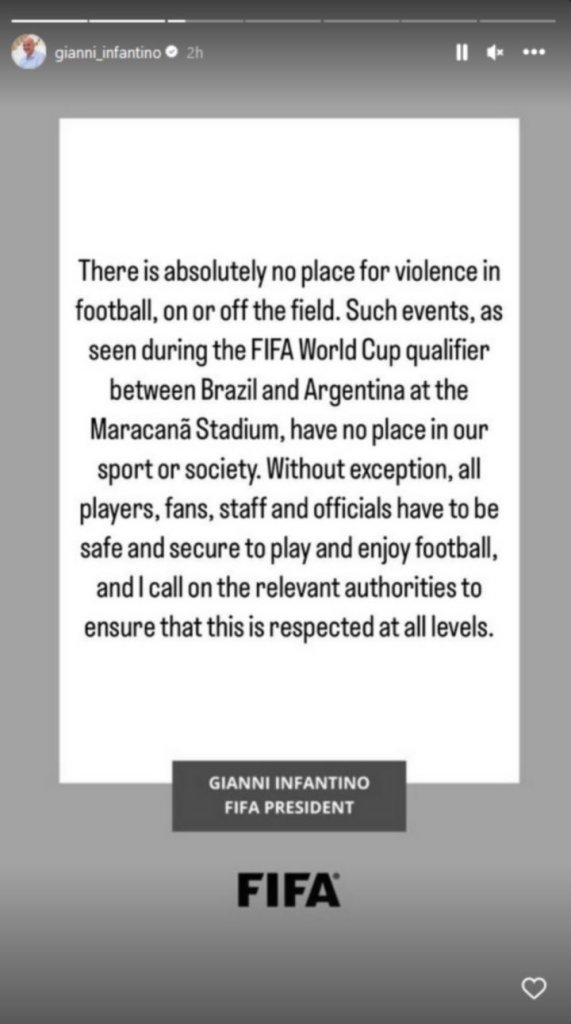 Ήταν μάλιστα τόσο βίαιες και άσχημες οι εικόνες που ο Τζάνι Ινφαντίνο έσπευσε να τοποθετηθεί δημόσια, με τον πρόεδρο της FIFA να στέλνει ξεκάθαρο μήνυμα κατά της βίας μέσω δημοσίευσης που έκανε στον λογαριασμό του στο Instagram:
