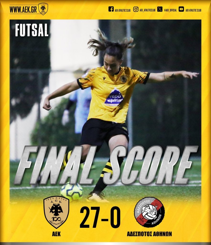 Η γυναικεία ομάδα Futsal της ΑΕΚ επικράτησε με το σκορ-ρεκόρ 27-0 του Αδέσποτου Αθηνών για την 5η αγωνιστική του Α’ Ομίλου του Women’s Futsal Championship. Η «Ένωση» δεν άφησε κανένα περιθώριο στον αντίπαλό της, έφτασε τις 4 νίκες σε ισάριθμους αγώνες και φιγουράρει στην κορυφή του βαθμολογικού πίνακα.
