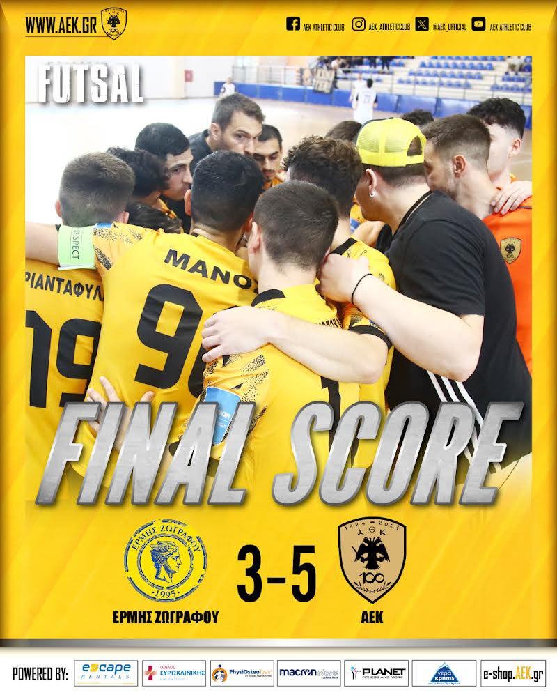 Συνεχίζει με ακόμα μία νίκη η ανδρική ομάδα Futsal της ΑΕΚ, η οποία επικράτησε 5-3 του Ερμή Ζωγράφου στο «Α. Φώτης» των Ιλισίων, στο πλαίσιο της 12ης αγωνιστικής της Futsal Super League, παραμένοντας έτσι στην κορυφή του βαθμολογικού πίνακα.