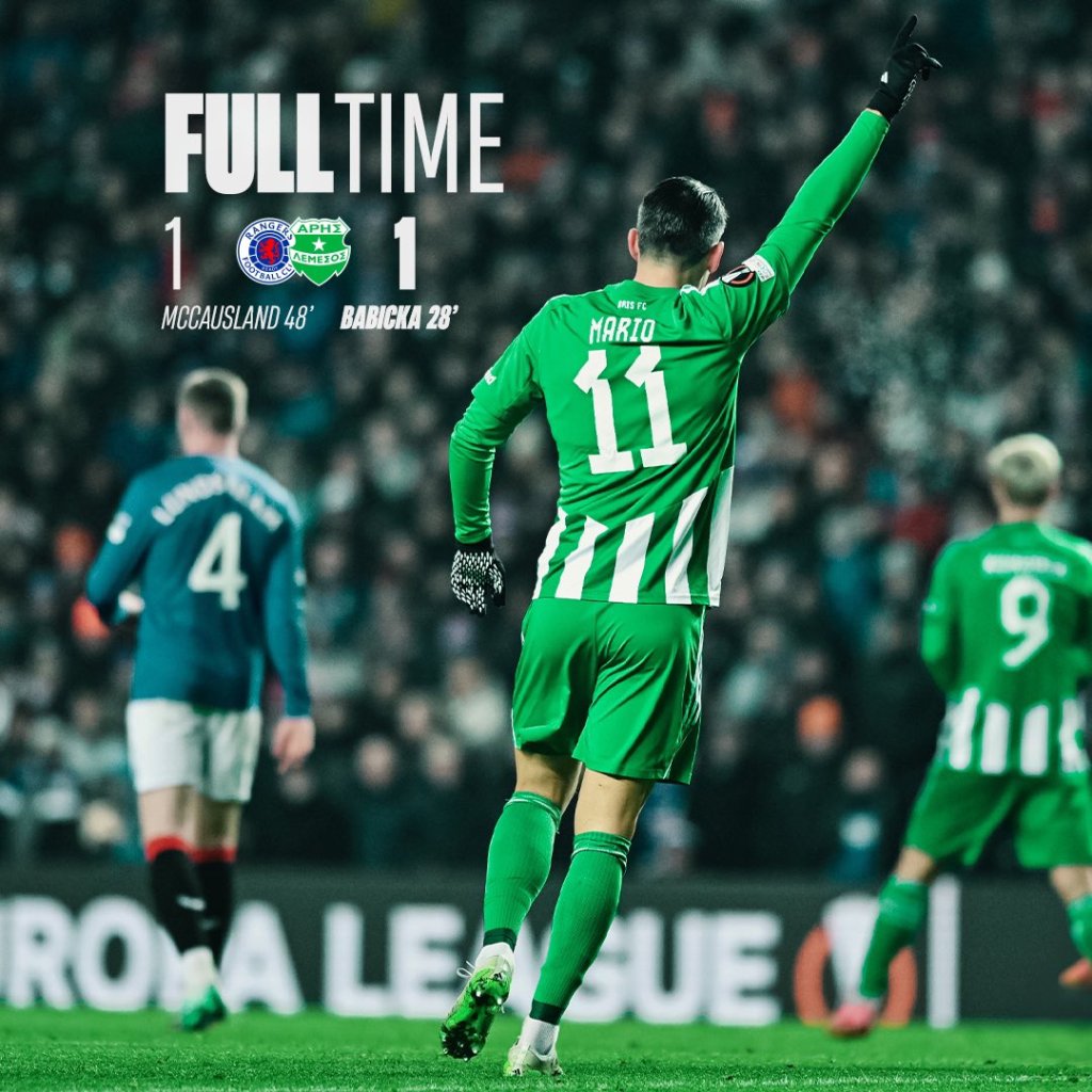 Μοιρασιά στο «Άιμπροξ». Ρέιντζερς και Άρης Λεμεσού "κόλλησαν" στο 1-1 για την 5η αγωνιστική του 3ου ομίλου. Έτσι, οι Σκωτσέζοι διατηρήθηκαν στην 2η θέση της βαθμολογίας, ενώ η κυπριακή ομάδα μπορεί να αποκλείστηκε οριστικά από το Europa League, ωστόσο διατήρησε τις ελπίδες της για πρόκριση στα play offs του Conference.