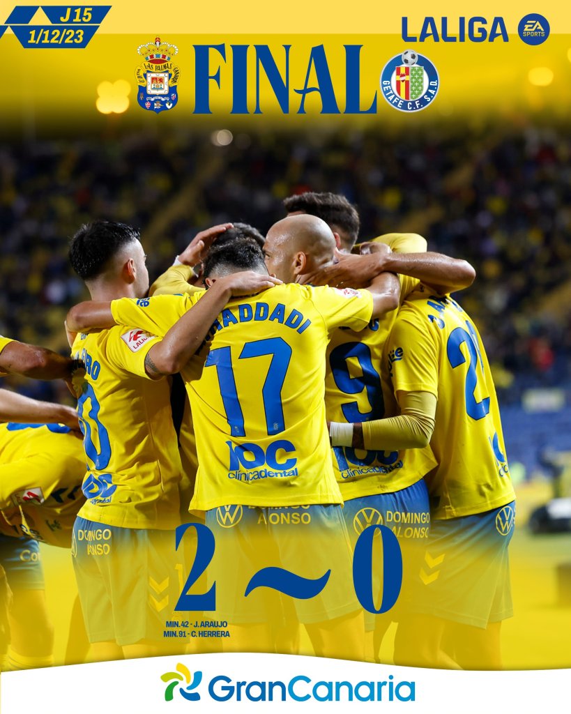 Μία σημαντική νίκη πανηγύρισε η Λας Πάλμας, που επιβλήθηκε εντός έδρας της Χετάφε με 2-0 και ανέβηκε στην 8η θέση του βαθμολογικού πίνακα της La Liga με 21 βαθμούς. Αντίθετα οι Μαδριλένοι ισοβαθμούν στην 9η θέση με τη Βαλένθια και τη Ράγιο Βαγιεκάνο, καθώς και οι τρεις ομάδες έχουν από 19 βαθμούς. Με δέκα ποδοσφαιριστές τελείωσαν την αναμέτρηση οι φιλοξενούμενοι λόγω αποβολής του Αλντερέτε στο 46’.