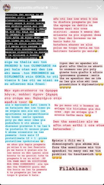 Ο Νέρι Καστίγιο απάντησε, γράφοντας, μεταξύ άλλων, τα εξής: "Περιμένεις η ομάδα να μην πάει καλά μπας και λένε το όνομά σου και γυρνάς πίσω. Αυτό σε νοιάζει μόνο. Δεν είναι τυχαίο που άλλη μια φορά μπήκες και δίνεις συνέντευξη 3-4 μέρες πριν παίξουμε τον αγώνα στη Γερμανία. Τα είχες όλα υπολογισμένα.