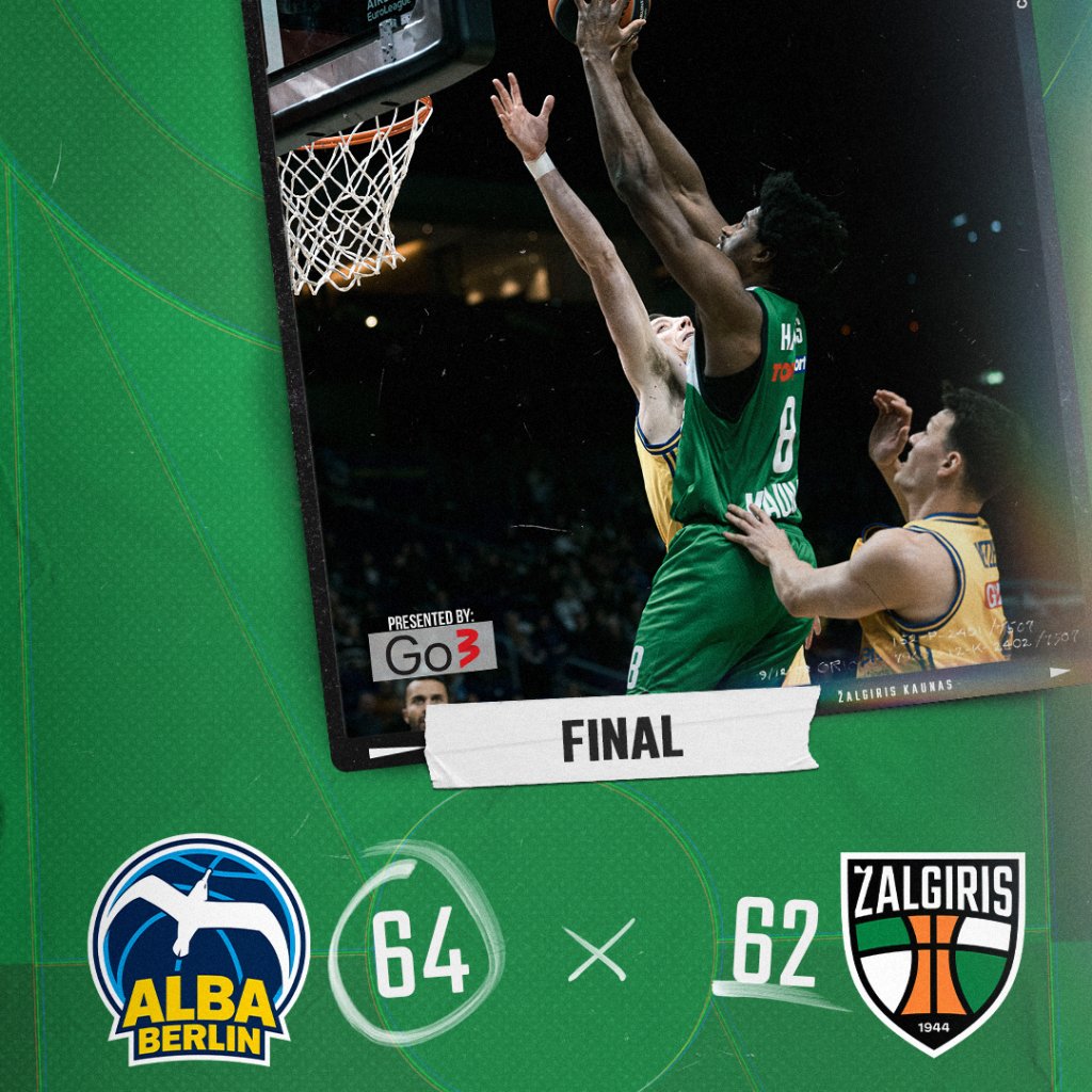 Τεράστια νίκη για την Άλμπα Βερολίνου η οποία επικράτησε της Ζαλγκίρις Κάουνας με 64-62, έπειτα από άστοχο σουτ τριών πόντων του Ουλάνοβας στη λήξη της αναμέτρησης. Οι Λιθουανοί ήταν αυτοί που είχαν τον έλεγχο της αναμέτρησης στη μεγαλύτερη διάρκειά της, στο τέλος όμως, μίλησε η ψυχραιμία τους και η τύχη που ήταν με το μέρος τους.