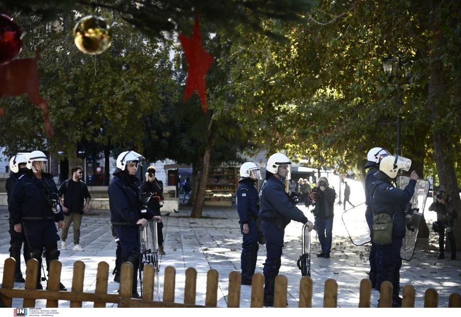 Άνδρες των ΜΑΤ ήταν παρατεταμένοι στην πλατεία Συντάγματος προκειμένου να φυλάξουν το Χριστουγεννιάτικο δέντρο από όσους συμμετείχαν στις εκδηλώσεις για τον Αλέξανδρο Γρηγορόπουλο.