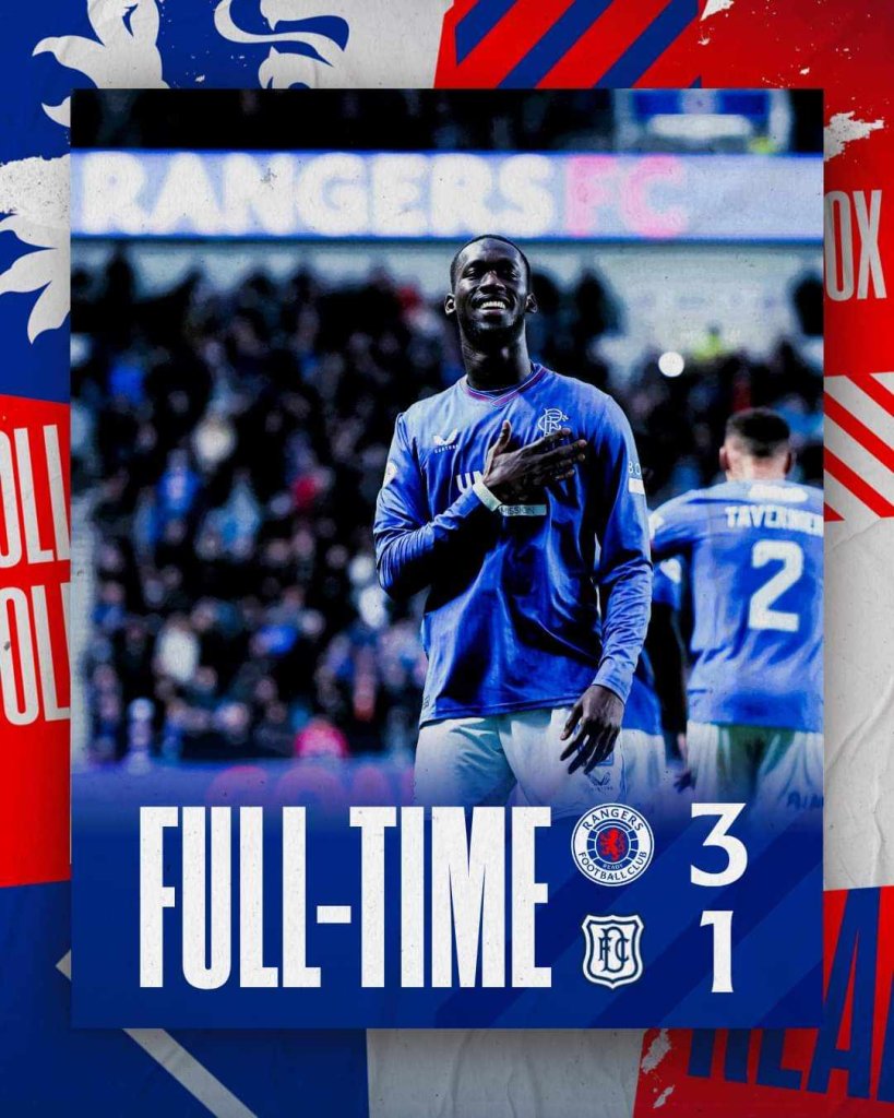 Τι κι αν η Ρέιντζερς μπήκε δυνατά στο παιχνίδι, η Νταντί ήταν εκείνη που ευτύχησε να προηγηθεί μόλις στο 5΄ με τον Μπακαγιόκο. Οι γηπεδούχοι δε πανικοβλήθηκαν ωστόσο, βρήκαν γκολ ισοφάρισης στο 20΄,με τον Ντέσερς και έκαναν την ανατροπή 2-1 με τον Ταβερνίρ με πέναλτι στο 26΄. Όμως, η Ρέιντζερς δεν έμεινε εκεί, καθώς ο Σίμα στο 34΄ έγραψε το τελικό 3-1. Στις καθυστερήσεις του ημιχρόνου μάλιστα, οι γηπεδούχοι έμειναν με 10 παίκτες, έπειτα από αποβολή του Σιφουέντες με απευθείας κόκκινη, ύστερα από παρέμβαση και του ΒΑΡ. Η Ρέιντζες, έκανε λοιπόν το καθήκον της και ελπίζει σε γκέλα της Σέλτικ για να μειώσει την απόσταση απο τη κορυφή.