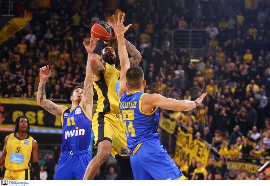 Ο Άρης βρήκε τέσσερα σουτ από την περιφέρεια στην πρώτη περίοδο, ενώ εξασφάλισε και έξι περισσότερα ριμπάουντ από το Περιστέρι για να προηγηθεί με 18-12 στο δεκάλεπτο. Οι γηπεδούχοι βρήκαν το πρώτο τους διψήφιο προβάδισμα στο 11'30" (26-14), ενώ στο 13' βρέθηκαν στο 29-16. Η ομάδα του Βασίλη Σπανούλη απάντησε με ένα σερί 10-0, με δύο τρίποντα από Γουίλιαμς και Ράγκλαντ, για να πλησιάσει σε 29-26 στο 17'50". Ο Τολιόπουλος έβαλε φρένο σε αυτό, με ένα γκολ-φάουλ, ενώ τελικά οι κιτρινόμαυροι πήγαν στα αποδυτήρια στο +7 (37-30, 20').