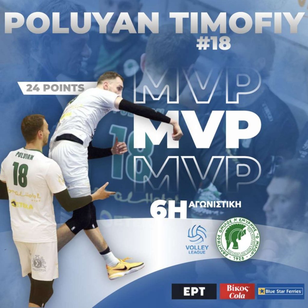 Ο Ουκρανός ακραίος του Α.Ο.Ν.Σ.Μίλων Τίμοφι Πολουγιάν (Tymofiy Poluyan) αναδείχτηκε πολυτιμότερος αθλητής MVP Βίκος Cola της 6ης αγωνιστικής στο πρωτάθλημα Volley League 2023-24.
