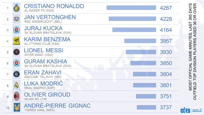 O Κριστιάνο Ρονάλντο είναι ο παίκτης που έχει παίξει τα περισσότερα λεπτά από οποιονδήποτε άλλο στον κόσμο, ανάμεσα σε παίκτες ηλικίας 36 ετών και άνω τις τελευταίες 365 ημέρες. Ο Πορτογάλος σούπερ σταρ της Αλ Νασρ αγωνίστηκε 4.267 λεπτά και βρίσκεται μπροστά από τον Γιαν Βερτόγκεν (Άντερλεχτ/ 4.228 λεπτά), ενώ το βάθρο ολοκληρώνει ο Γιουράι Κούτσκα (Σλόβαν Μπρατισλάβας/4.164).
