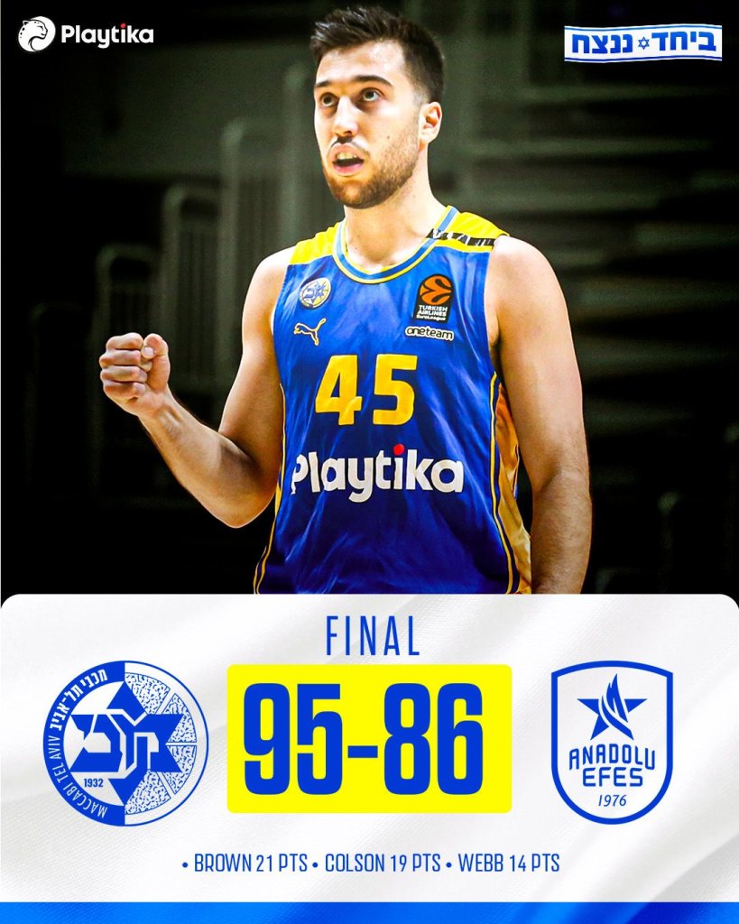 Σπουδαία επικράτηση για τη Μακάμπι η οποία πήρε την νίκη κόντρα στη… φορτσάτη Εφές με 95-86. Κορυφαίος για τους νικητές ήταν ο Λορένζο Μπράουν που είχε 21 πόντους και 5 ασίστ, ενώ ο Κόλσον σταμάτησε στους 19. Για την Εφές πρώτος σκόρερ ήταν ο Ντάριους Τόμπσον με 22 πόντους, ενώ ο Ντάουμ είχε 20.