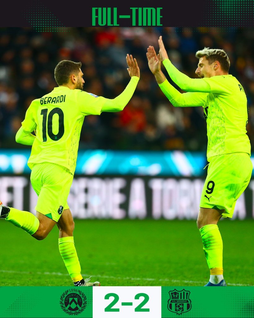 Στο 83’ η κεφαλιά του Μουλατιέρι τράνταξε το δοκάρι της Ουντινέζε και στο 85’ η Σασουόλο κέρδισε νέο πέναλτι και ο Μπεράρντι ευστόχησε και πάλι για το 2-2.