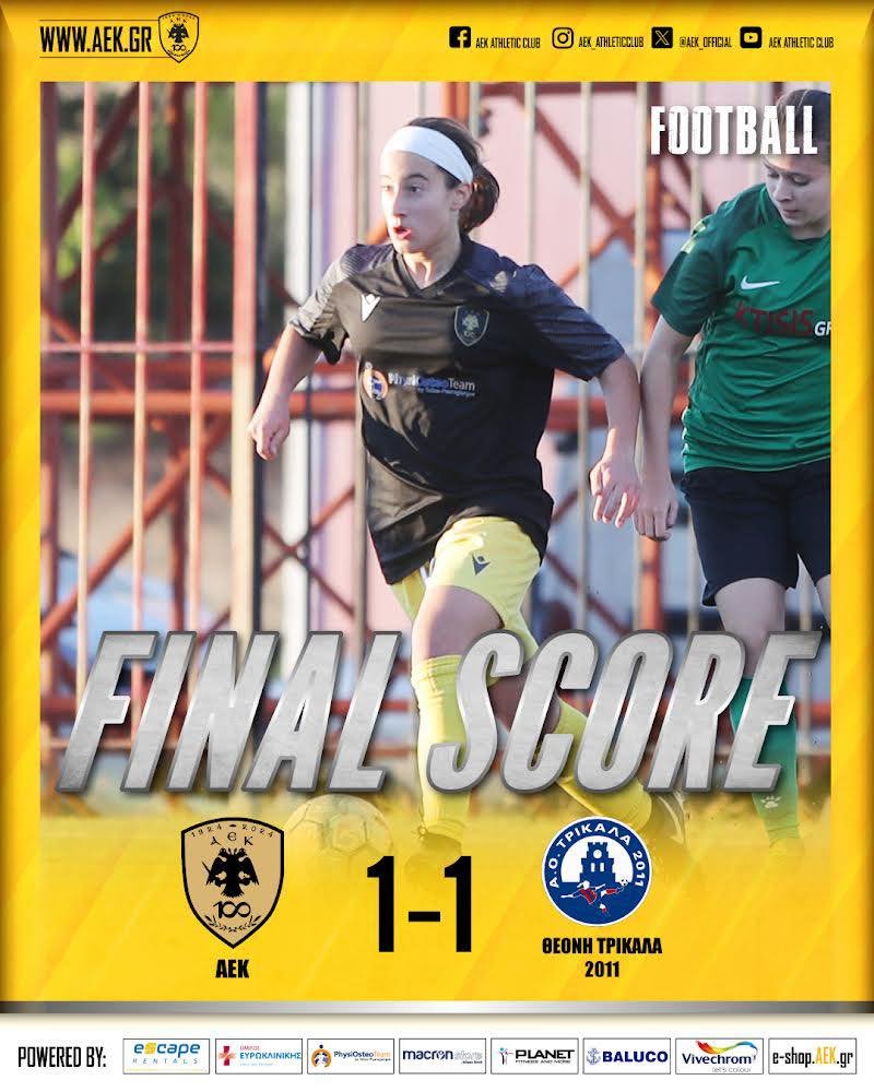 Ισόπαλη (1-1) ήρθε η γυναικεία ομάδα ποδοσφαίρου της ΑΕΚ, απέναντι στη Θεόνη Τρικάλων 2011, στο πλαίσιο της 9ης αγωνιστικής της Women’s Football League. Μετά το τέλος της αναμέτρησης, γνωστοποιήθηκε στον προπονητή, Νίκο Γκαλίτσιο, το τέλος της συνεργασίας του με την ΑΕΚ.