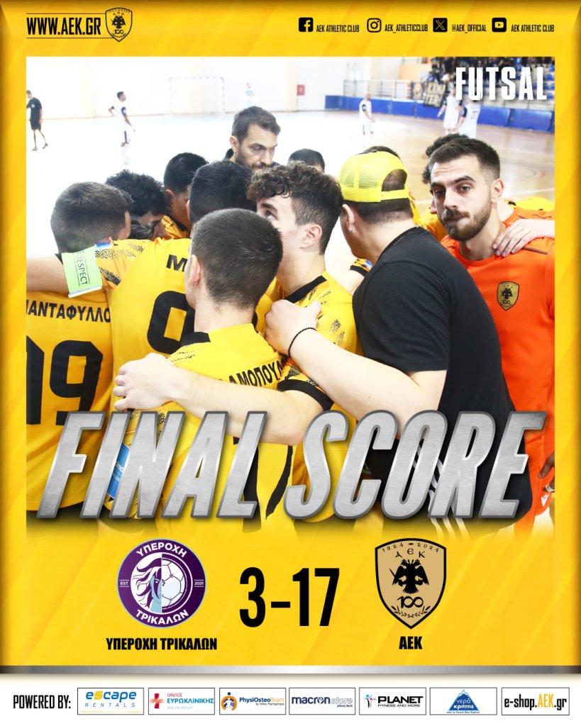 Νέα νίκη για την ανδρική ομάδα Futsal της ΑΕΚ, που πέρασε με 17-3 από τα Τρίκαλα κόντρα στην τοπική Υπεροχή, για την 15η αγωνιστική της Futsal Super League. Οι «κιτρινόμαυροι» με πολύ καλή εμφάνιση και αποδίδοντας πολύ ωραίο ποδόσφαιρο κατέκτησαν ένα ακόμα τρίποντο, που τους διατηρεί στην κορυφή του βαθμολογικού πίνακα, ενώ αναμένουν και το αποτέλεσμα του ΑΣΕ Δούκα που κοντράρεται με τον Παναθηναϊκό.