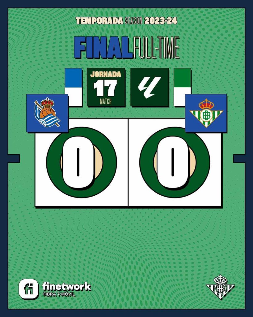 Σε αναμέτρηση με μεγάλο ενδιαφέρον και με Ευρωπαϊκό ορίζοντα Σοσιεδάδ και Μπέτις έμειναν στην ισοπαλία. Η ισοπαλία αυτή ικανοποιεί τους φιλοξενούμενους και τη Αθλέτικ Μπιλπάο που έμεινε μόνη 5η στη βαθμολογία.