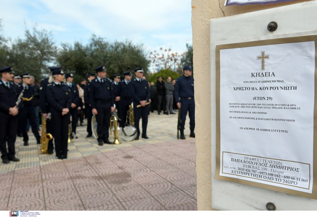 Με βαθιά θλίψη και οδύνη, συγγενείς και φίλοι αποχαιρέτησαν, στον Ιερό Ναό Αγίας Τριάδος στην Πάτρα, τον Χρήστο Κουρουνιώτη, τον αστυνομικό της ομάδας ΔΙΑΣ που έχασε τη ζωή του σε καταδίωξη στην Εθνική Οδό Αθηνών-Κορίνθου, τα ξημερώματα της Δευτέρας.