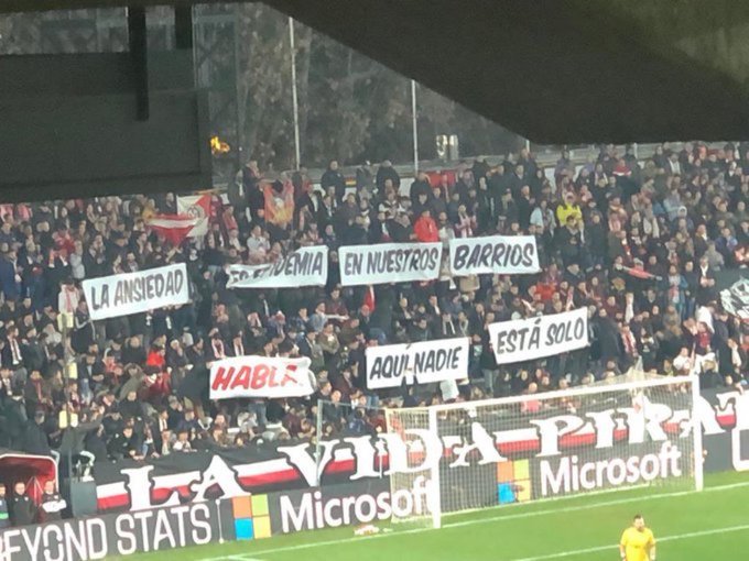 «Το άγχος είναι επιδημία σε όλες τις γειτονιές. Μιλήστε. Κανένας δεν είναι μόνος», έγραψαν οι φίλαθλοι της Ράγιο Βαγιεκάνο, οι οποίοι δεν μπόρεσαν να πανηγυρίσουν στο τέλος, καθώς η Βαλένθια επικράτησε με 1-0.