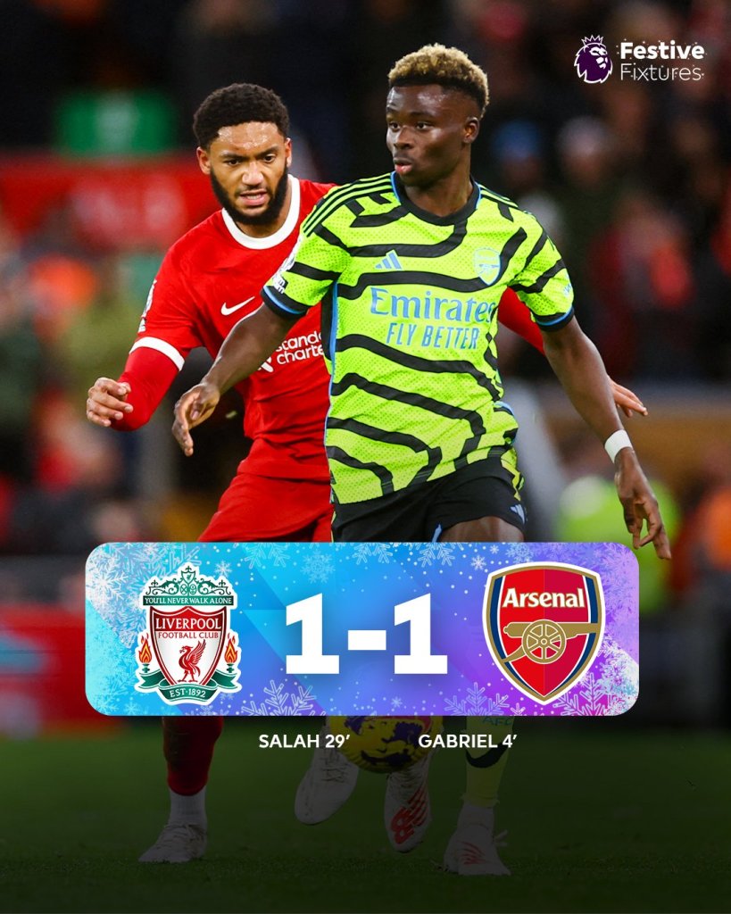 Σε ένα ντέρμπι που είχε δύο γκολ, δύο δοκάρια, πολύ ένταση και καταιγιστικό ρυθμό, Λίβερπουλ και Άρσεναλ έμειναν στο 1-1 για την 18η αγωνιστική της Premier League. Κάπως έτσι, οι «Κόκκινοι» έχασαν την ευκαιρία να βρεθούν μόνοι πρώτοι, ενώ από την πλευρά τους οι «Κανονιέρηδες» παρέμειναν στην κορυφή με μόλις έναν βαθμό διαφορά από τους σημερινούς αντιπάλους τους και την Άστον Βίλα. Δύο δοκάρια για τους γηπεδούχους