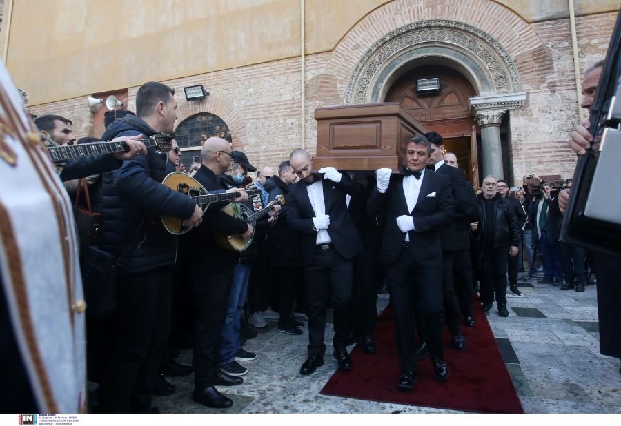 Τραγικές φιγούρες, η σύζυγος και η κόρη του Βασίλη Καρρά. Την ώρα που η μπάντα του λαϊκού τραγουδιστή έλεγε το τελευταίο αντίο, παίζοντας τις αξέχαστες επιτυχίες του, «Νύχτα ξελογιάστρα» και «Δεν πάω πουθενά», δεν μπόρεσε να κρατήσει τα δάκρυά της η σύζυγος του λαϊκού τραγουδιστή.