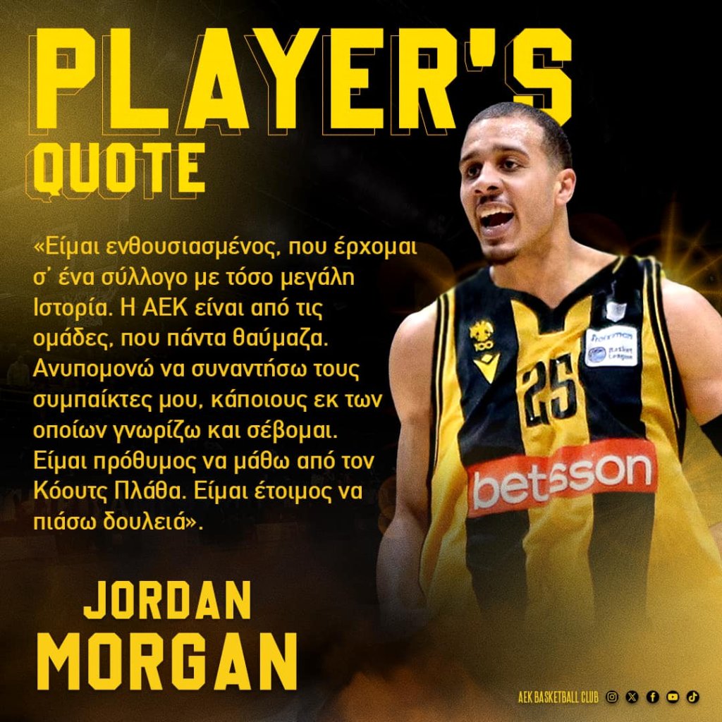 Τις πρώτες του δηλώσεις ως παίκτης της ΑΕΚ έκανε ο Τζόρνταν Μόργκαν. Μιλώντας στην επίσημη ιστοσελίδα της Βασίλισσας είπε: «Είμαι ενθουσιασμένος που έρχομαι σε έναν σύλλογο με τόσο μεγάλη ιστορία. Η ΑΕΚ είναι από τις ομάδες που πάντα θαύμαζα. Ανυπομονώ να γνωρίσω τους συμπαίκτες μου, κάποιους εκ των οποίων θαυμάζω και σέβομαι. Είμαι έτοιμος να μάθω από τον κόους Πλάθα. Είμαι έτοιμος να πιάσω δουλειά».
