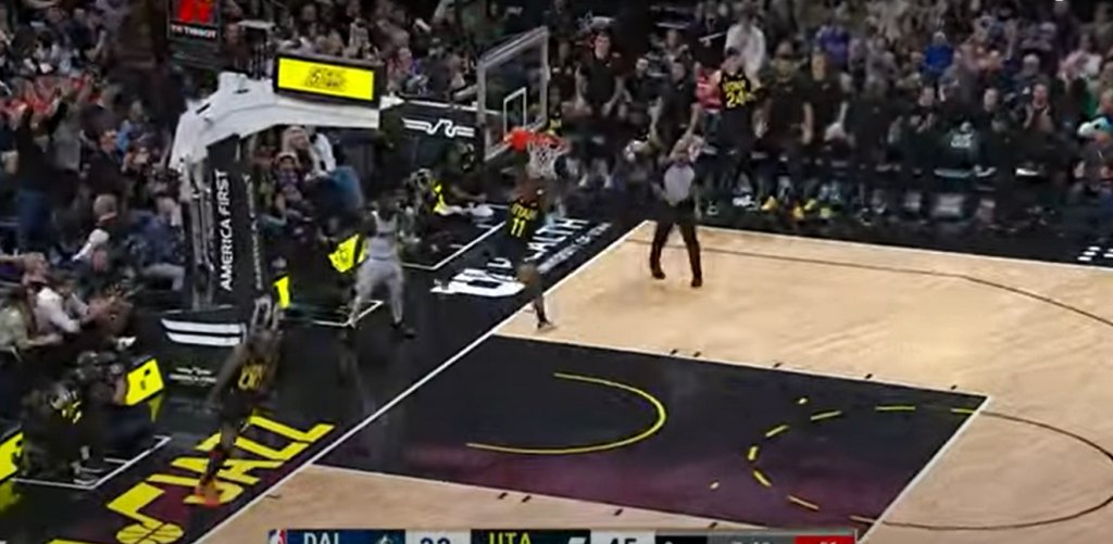 Στην αναμέτρηση με τους Ντάλας Μάβερικς, ο Τζόρνταν Κλάρκσον των Γιούτα Τζαζ έφυγε στον αιφνιδιασμό και έδωσε ασίστ, πίσω από την πλάτη, στον Ναν που κάρφωσε στο αντίπαλο καλάθι.