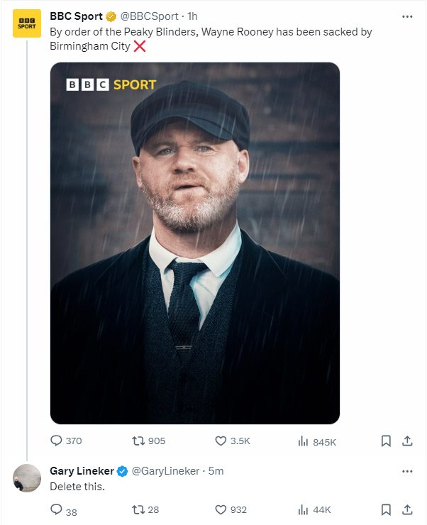 Η διοίκηση προχώρησε στην απόλυση του Άγγλου και το BBC "ανέβασε" στα social media, μια φωτογραφία του Γουέιν Ρούνεϊ ως... Τόμι Σέλμπι, από τη δημοφιλή σειρά "Peaky Blinders". "Με διαταγή των Peaky Blinders, o Γουέιν Ρούνεϊ απολύθηκε από την Μπέριγχαμ", έγραφε η λεζάντα, επειδή η εγκληματική συμμορία για την οποία έγινε και επιτυχημένη σειρά στο BBC έδρασε στο Μπέρμιγχαμ.