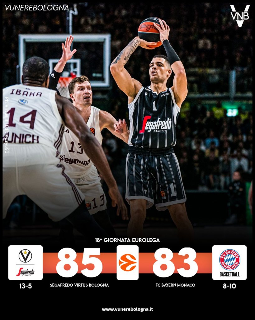 Μετά το Βελιγράδι, ο Ίφε Λούντμπεργκ το έκανε και στην Μπολόνια καθώς έβαλε το σουτ του αγώνα και οδήγησε τη Βίρτους στην έκτη νίκη της στους τελευταίους επτά αγώνες καθώς επικράτησε της Μπάγερν με 85-83. Στο 13-5 ανέβηκε η ομάδα του Λούκα Μπάνκι (9-1 εντός και 4-4 εκτός έδρας).