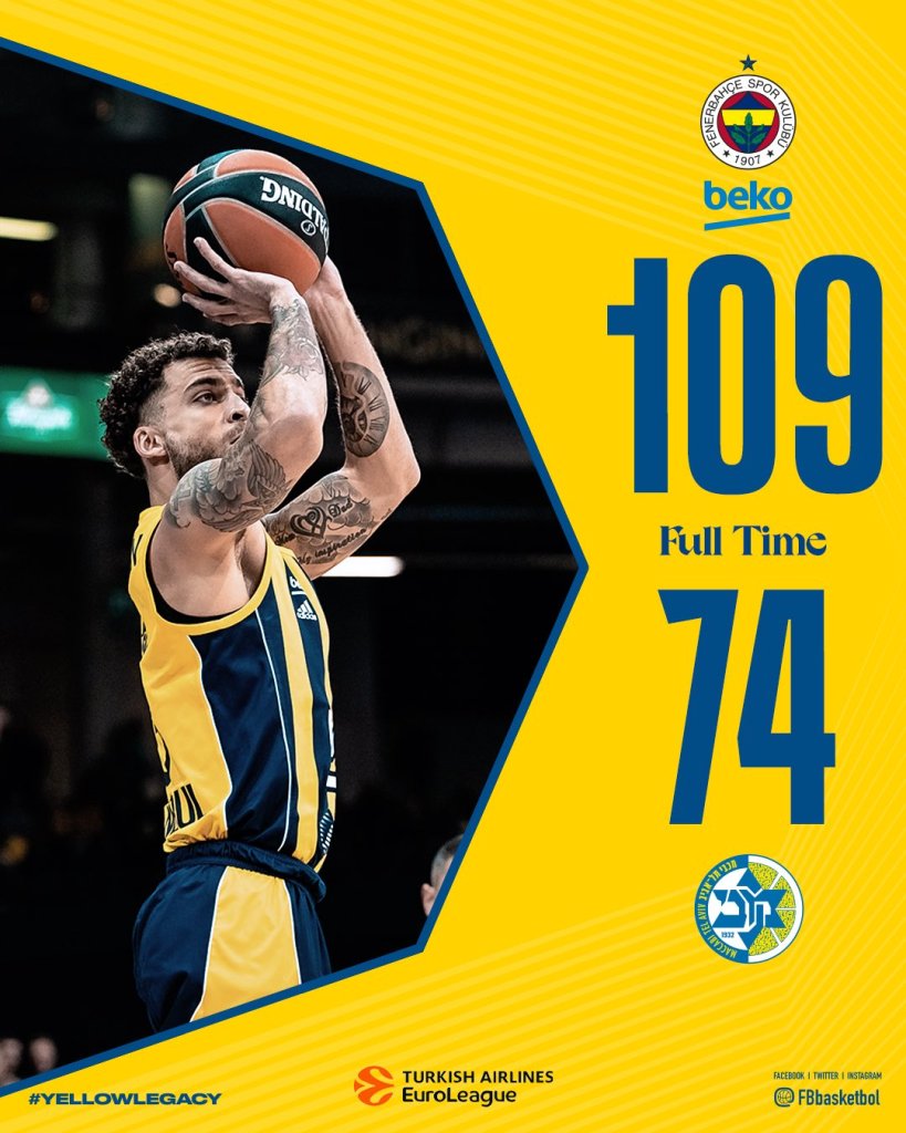 Μετά την εντός έδρας ήττα από τον Ερυθρό Αστέρα, η Φενέρμπαχτσε έβγαλε αντίδραση και "πάτησε" τη Μακάμπι Τελ Αβίβ με το εμφατικό 109-74 στο Πανεβέζις της Λιθουανίας, για τη 19η αγωνιστική της EuroLeague. Η ομάδα του Σαρούνας Γιασικεβίτσιους έκανε εξωπραγματικά πράγματα στη δεύτερη περίοδο, τρέχοντας επιμέρους 35-9 και τελειώνοντας ουσιαστικά τη δουλειά.