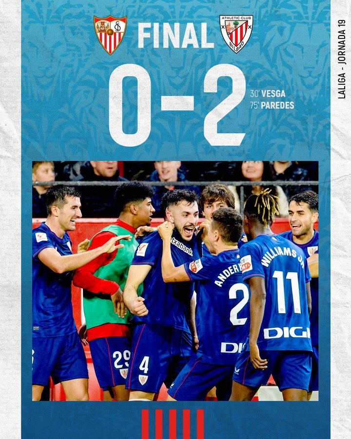 Σεβίλλη και Αθλέτικ Μπιλμπάο τέθηκαν αντιμέτωπες στο «Σάντσεθ Πιθχουάν» για την 19η αγωνιστική της La Liga. Οι Βάσκοι ήταν ανώτεροι από τους αντιπάλους τους σε όλη την διάρκεια της αναμέτρησης, κέρδισαν δίκαια με 2-0, έμειναν για 9ο σερί ματς αήττητοι και ανέβηκαν έστω και προσωρινά στην 3η θέση(ισοβαθμούν με Ατλέτικο και Μπαρτσελόνα)! Όσον αφορά τους Ανδαλουσιανούς παρέμειναν στο -1 από την ζώνη του υποβιβασμού.