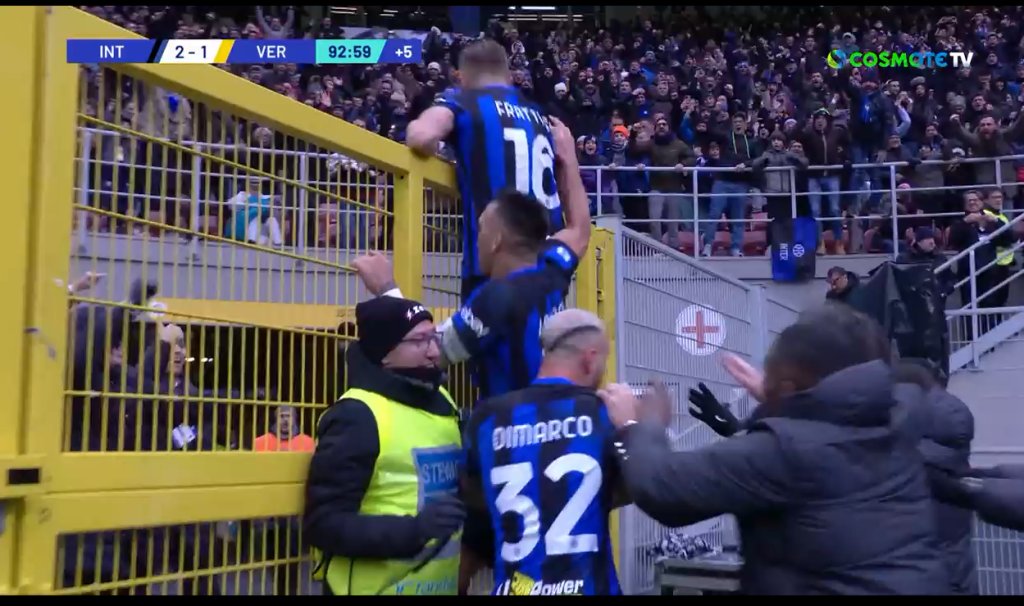 Πανζουρλισμός στο "Τζουζέπε Μεάτσα", όταν, στο 93ο λεπτό, ο Νταβίντε Φρατέζι έστειλε την μπάλα στα δίχτυα, δίνοντας προβάδισμα στην Ίντερ, 2-1 την Ελλάς Βερόνα.