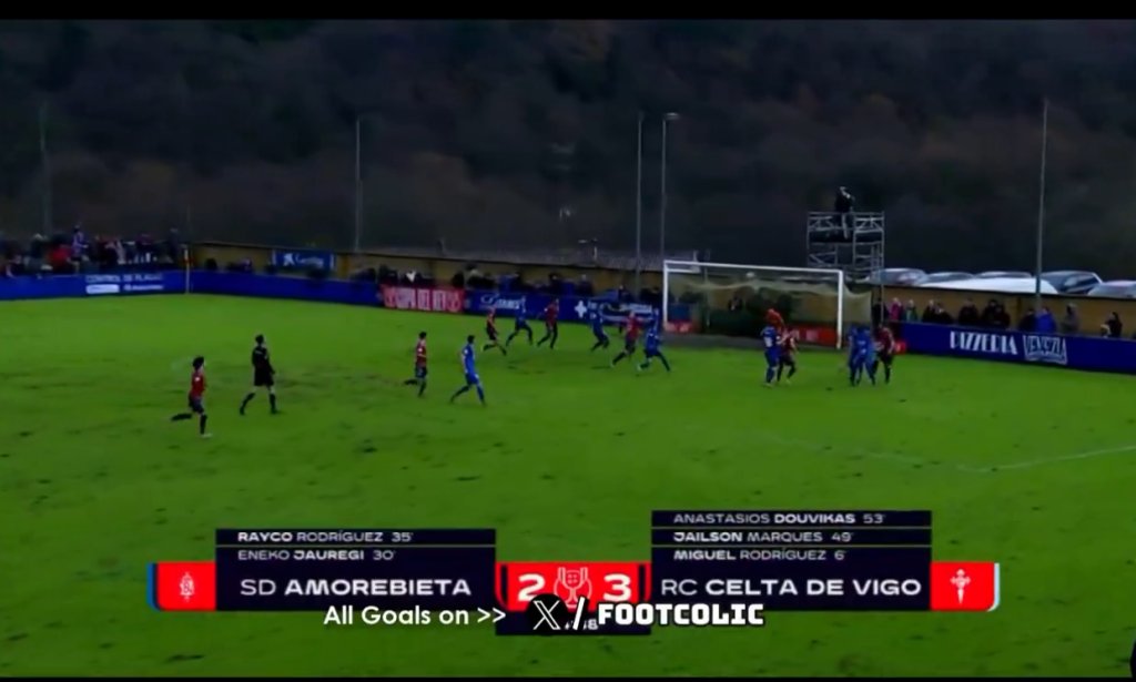 Στο εκτο λεπτό, ο Μιγκέλ Ροντρίγκες άνοιξε το σκορ, για λογαριασμό της Θέλτα, αλλά, σε διάστημα πέντε λεπτών, η Αμορεμπιέτα έφτασε σε ολική ανατροπή, με σκόρερ τους Χουρέγκι (30') και Ράικο Ροντρίγκες (35'). Στο 49', από ασίστ του Δουβίκα, ο Τζάιλσον ισοφάρισε, με τον Έλληνα φορ να σκοράρει δυο φορές και να σφραγίζει την πρόκριση της Θέλτα.